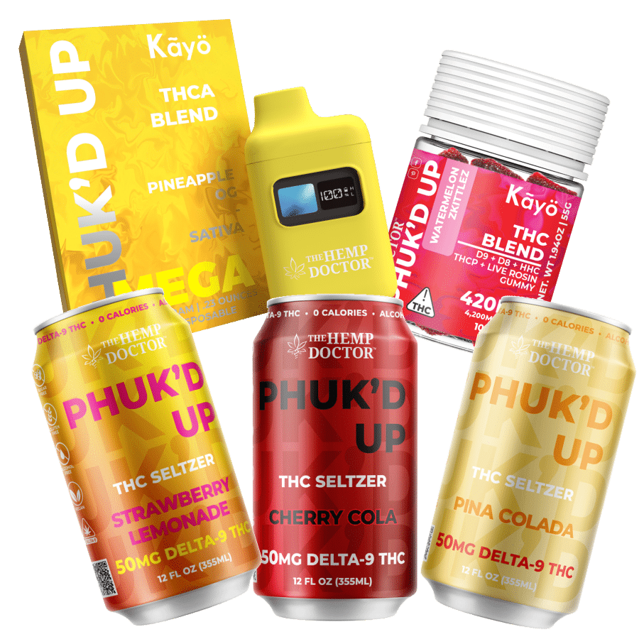 Quench your thirst with The Hemp Doctor’s Phuk’d Up Seltzer – a refreshing seltzer infused with 50mg Delta 9 THC. With refreshing flavors like Strawberry Lemonade and Pina Colada, it’s the perfect tropical companion for any occasion. And stay tuned for the exciting addition of Cherry Cola flavor! A smooth soda feel with the knockout punch of a potent Phuk’d Up product!
