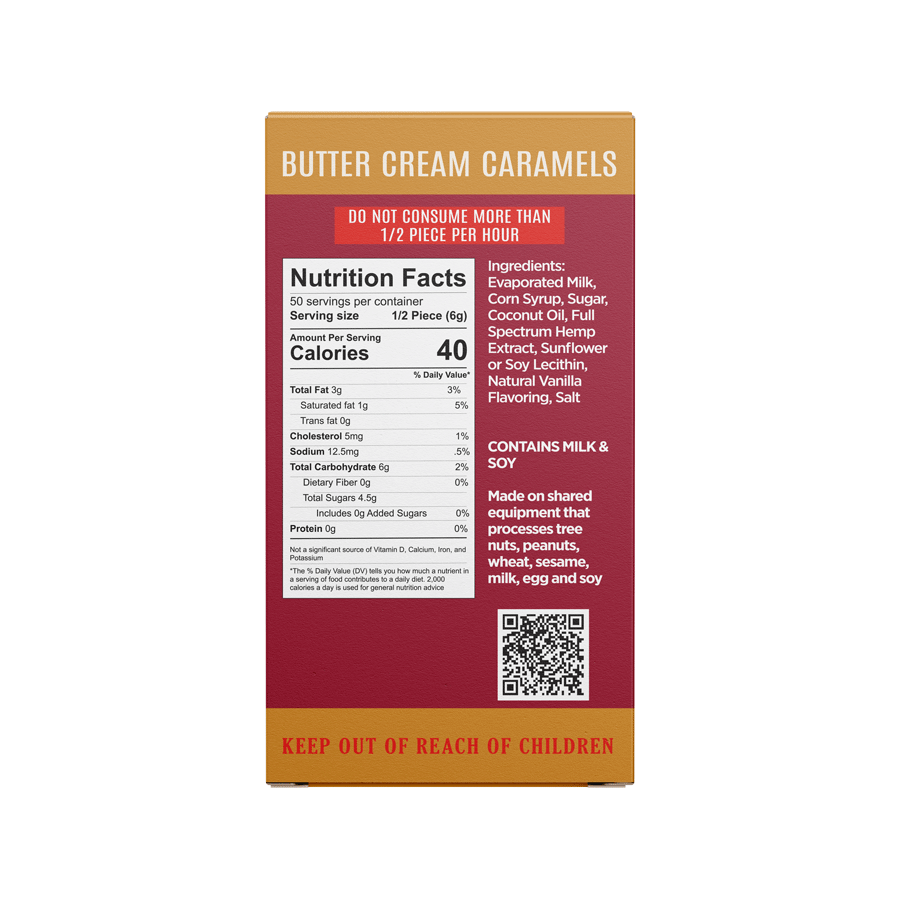 A perfect 1:1 ratio of D9 and CBD, with 15mg D9/15mg CBD per piece! This 1:1 D9:CBD Butter Cream Caramel is 30mg of sweet harmony