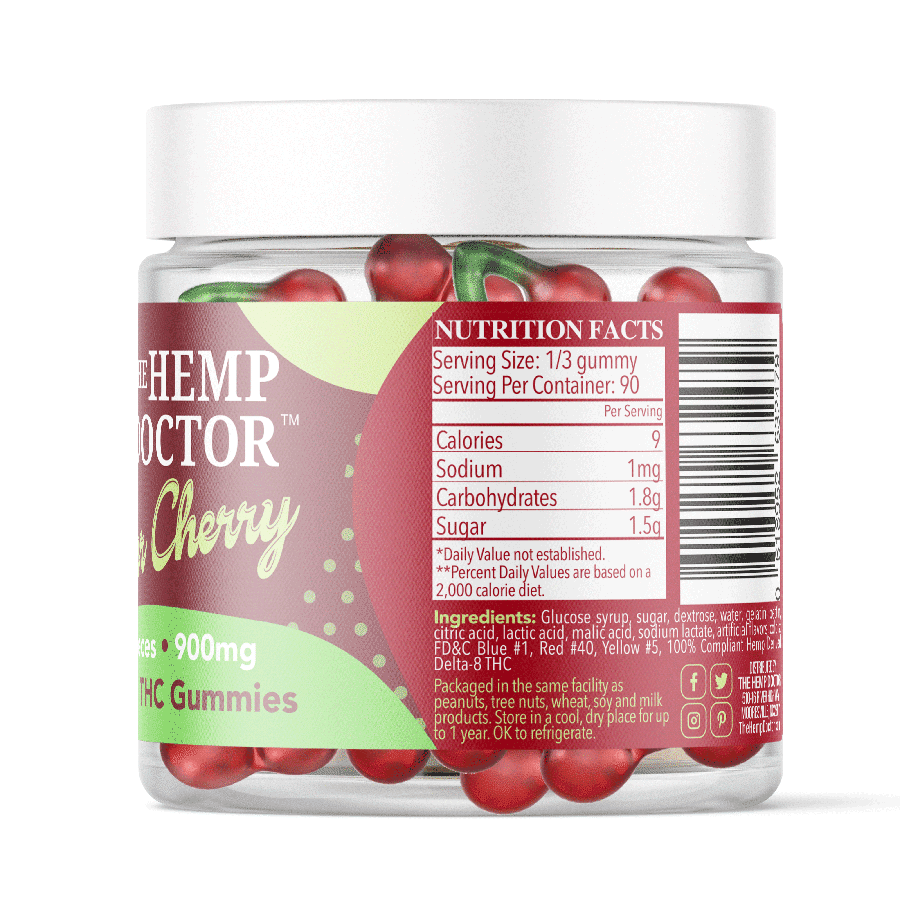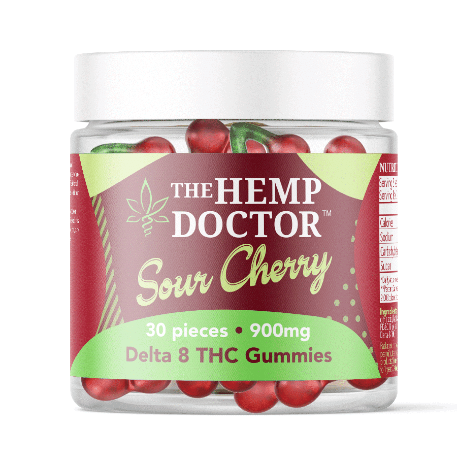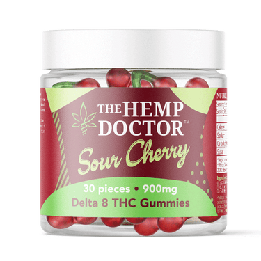 Tempt your taste buds! At the Hemp Doctor, we proudly introduce our premium Delta 8 Sour Cherry Gummies. Each jar of this fun and mighty confection has 30 pieces, amounting to 900mg of D8. Each Delta 8 Sour Cherry gummy contains 30mg of our full spectrum Delta 8 THC gummies for a mildly euphoric experience. These tart-flavored treats offer a smokeless and convenient format, great for health-conscious adult consumers.