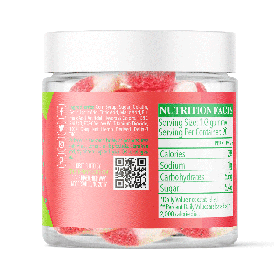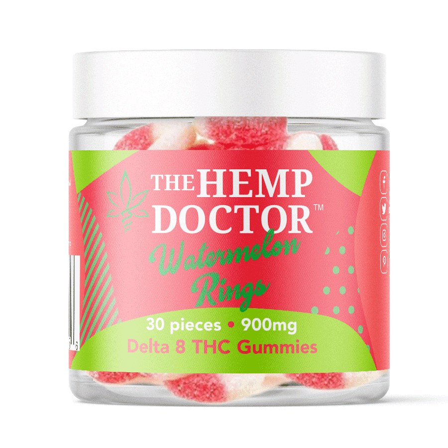 A fan favorite, bursting with flavor! Try our Delta 8 Watermelon Rings with 30mg of our high-quality D8 in every piece. These brightly-colored soft chews are available in various formats. Available in a 30-piece jar (with 900mg of D8 THC Total). Both discrete and easy, this smoke-free method produces a milder experience for consumers than D9 products, featuring a sweet and refreshing taste of watermelon. Great for summer picnics or just hanging out. Edibles like ours can add a new dimension to your health and wellness routine. Get only the best with The Hemp Doctor. These products have been lab-tested to ensure quality and potency. Enjoy the outstanding results D8 edibles can bring.