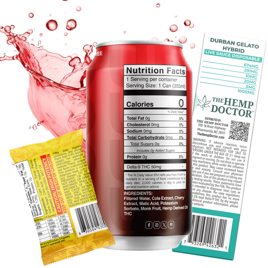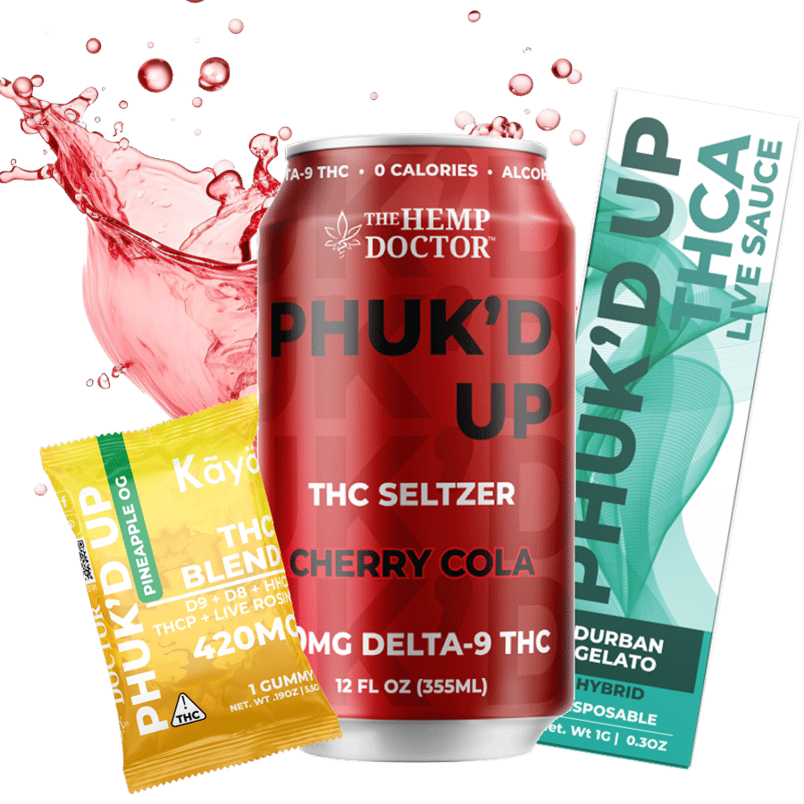 Quench your thirst with The Hemp Doctor’s Phuk’d Up Seltzer – a refreshing seltzer infused with 50mg Delta 9 THC. With refreshing flavors like Strawberry Lemonade and Pina Colada, it’s the perfect tropical companion for any occasion. And stay tuned for the exciting addition of Cherry Cola flavor! A smooth soda feel with the knockout punch of a potent Phuk’d Up product!