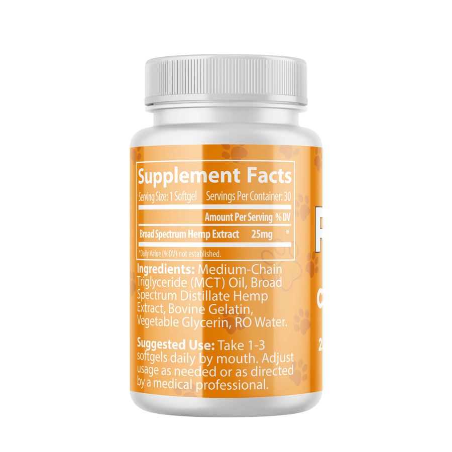 Administer 1-3 softgels daily by mouth. Adjust usage as needed or as directed by a medical professional. Each softgel contains 25 mg of Broad-Spectrum Hemp CBD, and the proper dose depends on many variables. We suggest talking to your vet to find the best solution for your furry friend.